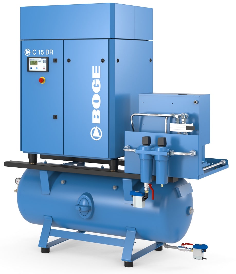 Основой компрессоров этой серии является интегрированный блок сжатия, состоящий из винтовой пары BOGE, системы сепарации масла, масляного и воздушного фильтров, регулятора всасывания, обратного и предохранительного клапанов, клапана минимального давления.